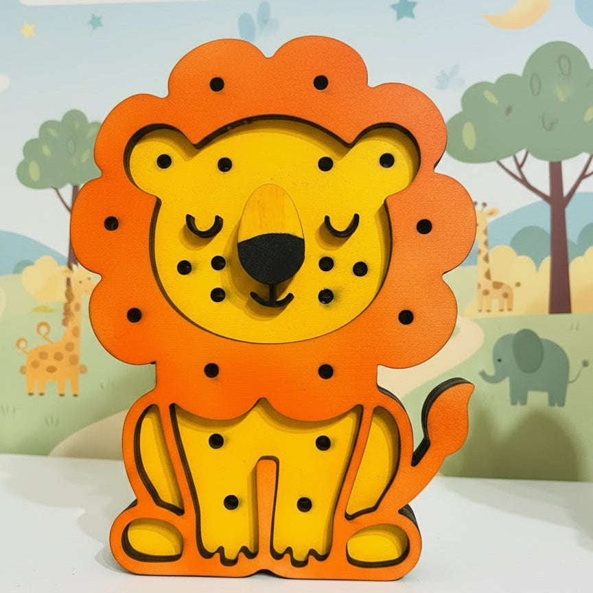 Questa dolcissima lampada in legno raffigura un leoncino stilizzato dai colori caldi, con criniera arancione sfumata e un’espressione tenera e rilassata. La figura è arricchita da numerosi punti luce LED che illuminano il corpo, creando un effetto luminoso morbido e accogliente, perfetto come luce notturna per la cameretta dei bambini.