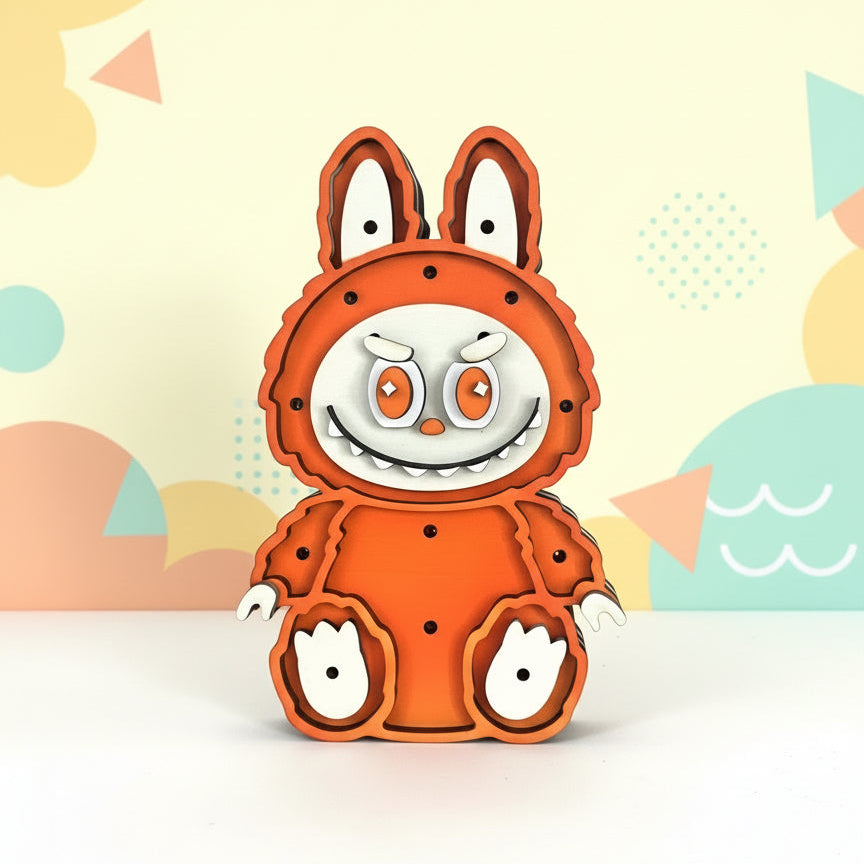 Questa lampada decorativa è realizzata in legno sagomato e dipinto, raffigurante un simpatico personaggio in costume rosa con dettagli espressivi e un fiocco verde in tessuto applicato sulla testa. La figura è impreziosita da piccoli punti luminosi LED che creano un effetto caldo e accogliente, ideale per la cameretta dei bambini.