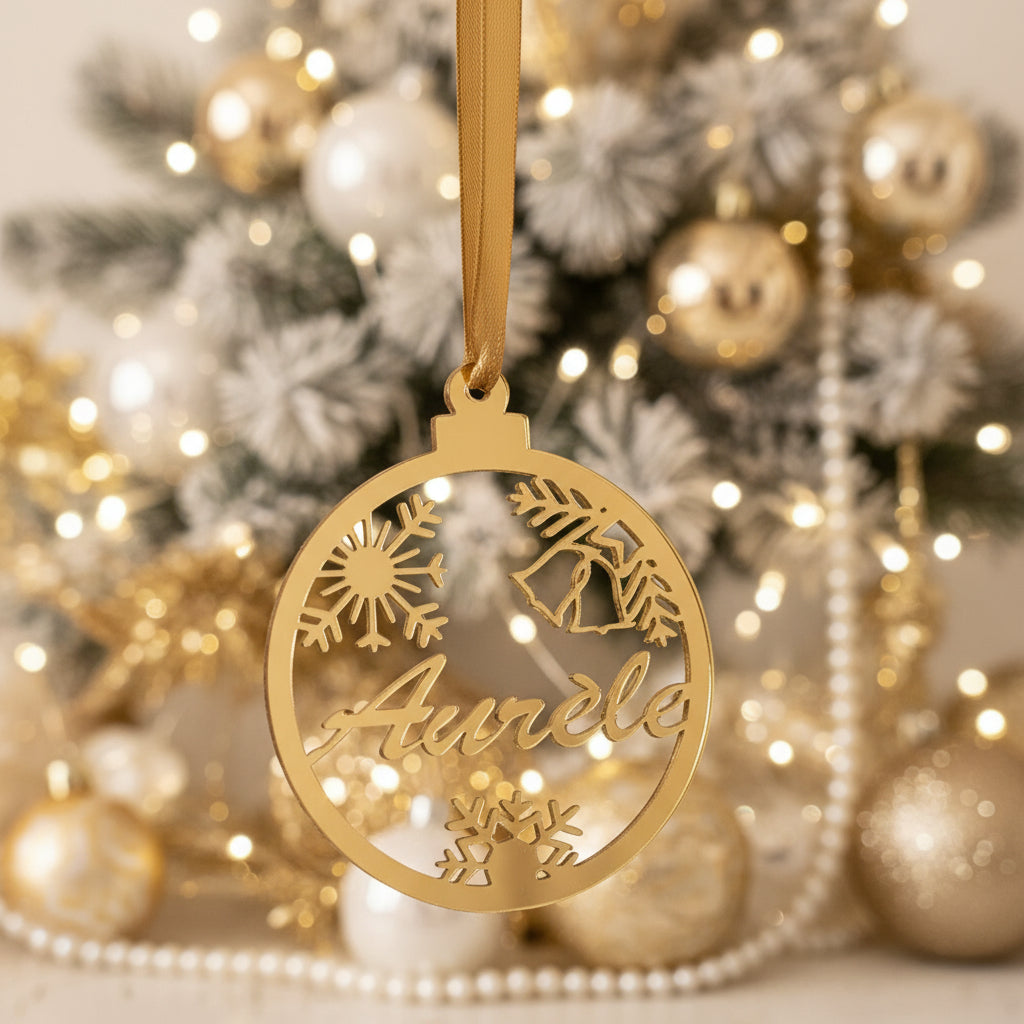 Realizzate in plexiglass Oro di alta qualità, resistente e luminoso, raffigurano la pallina Natalizia con il nome inciso o tagliato al centro.